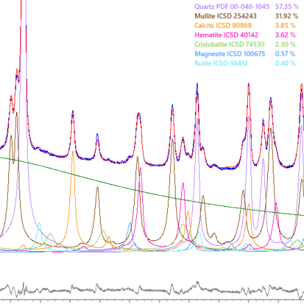 The classic; Rietveld semi-quantitative phase analysis. Rietveld will provide you with the relative amounts of the crystalline components of a sample, plus any disordered phases for which we have suitable empirical models, and derived elemental totals for reconiliation with other assays.